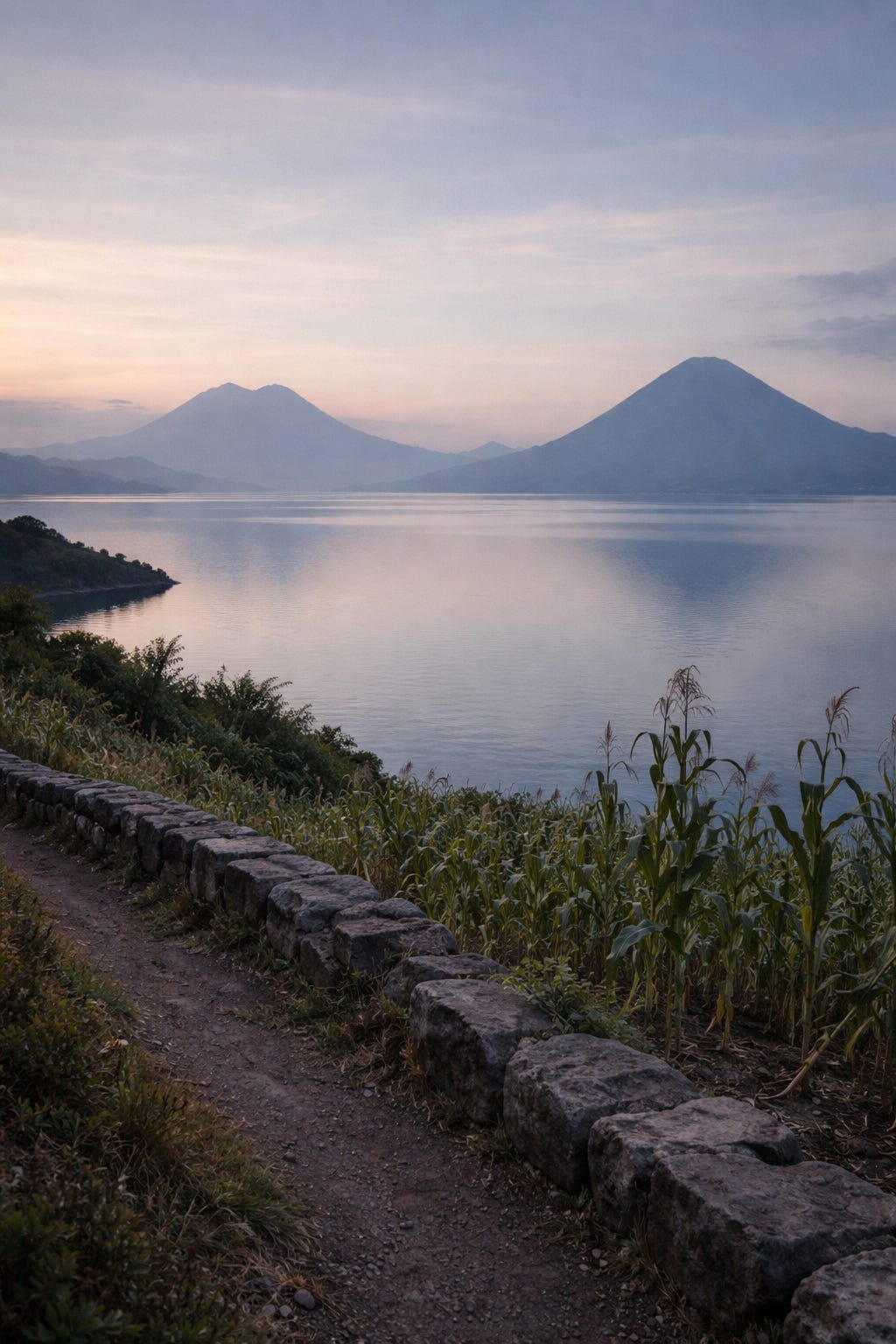 The lake is black glass. The volcanoes are shadows against a sky beginning to pale. I’m sitting on a stone wall built in 1640, watching Don Miguel move through his milpa in the pre-dawn dark.