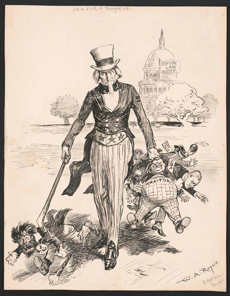 The Espionage Act of 1917 and the Sedition Act of 1918 made IWW organizing functionally illegal. Speaking against the war effort—which the IWW did, arguing that workers had no country—became a federal crime.
