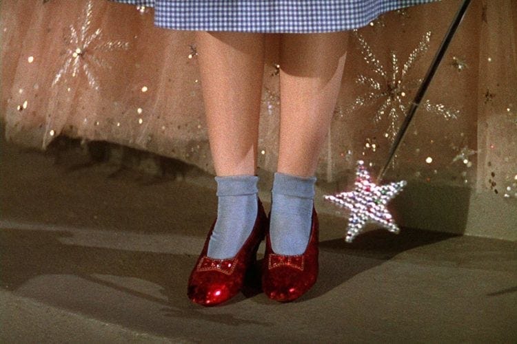 Dorothy stands in Munchkinland wearing dead woman’s shoes.