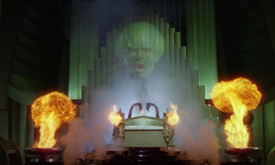 The curtain pulls back and there’s Frank Morgan, older man in a suit, pulling levers and speaking into a microphone, operating the machinery that created the floating head.